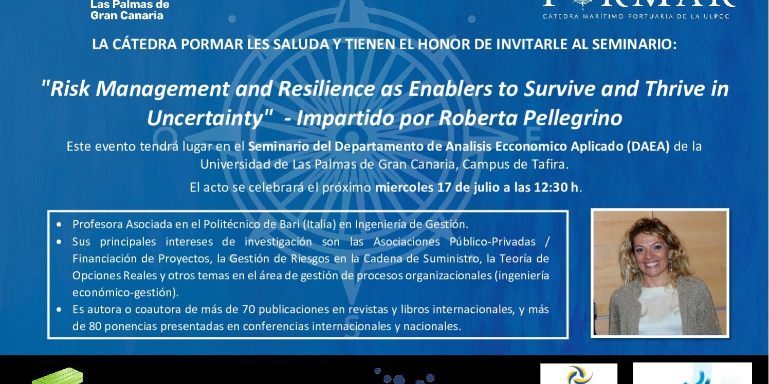 La Cátedra Marítimo-Portuaria (PORMAR) de la Universidad de Las Palmas de Gran Canaria se complace en invitarle al próximo evento que tendrá lugar en formato presencial el miércoles 17 de julio a las 12:30h en el seminario del Departamento de Análisis Económico Aplicado (DAEA) de la Universidad de Las Palmas de Gran Canaria, ubicado en el Campus de Tafira, Modulo D, Planta 2.